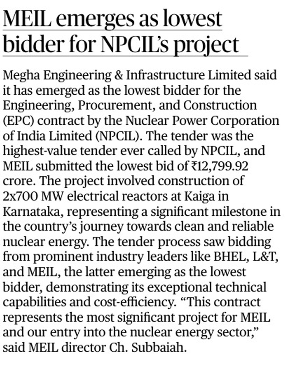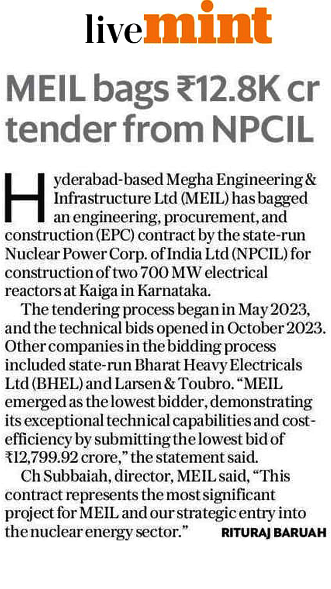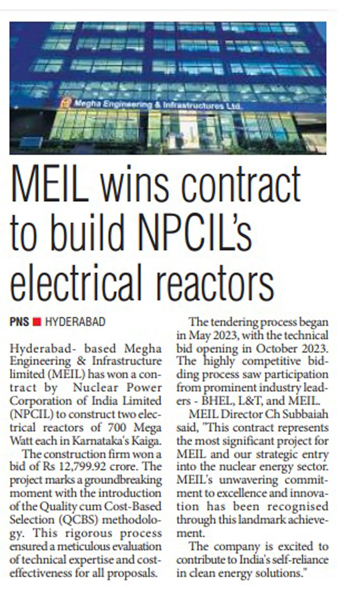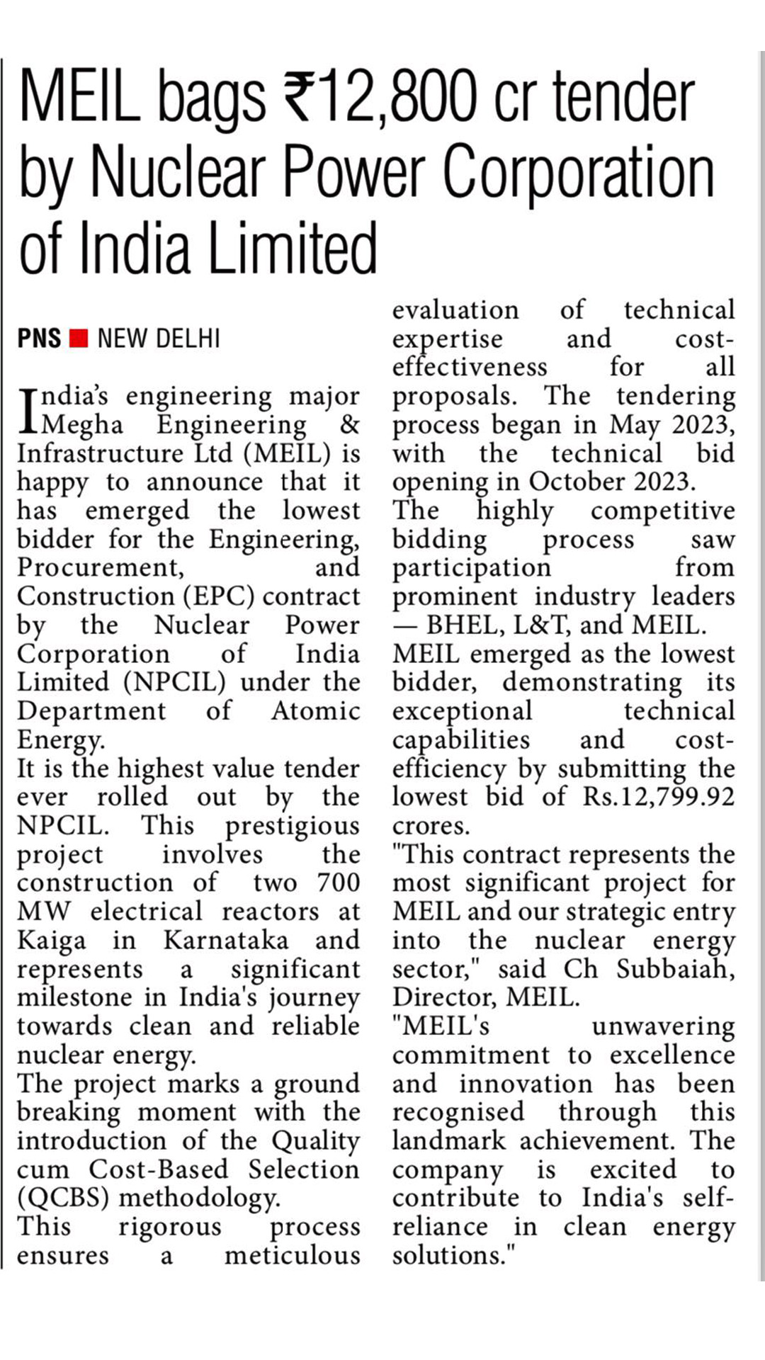 MEIL Wins Landmark EPC Contract from NPCIL MEIL is happy to announce that it has emerged as the lowest bidder for the Engineering, Procurement, and Construction (EPC) contract by the Nuclear Power Corporation of India Limited (NPCIL) under the Department of Atomic Energy.