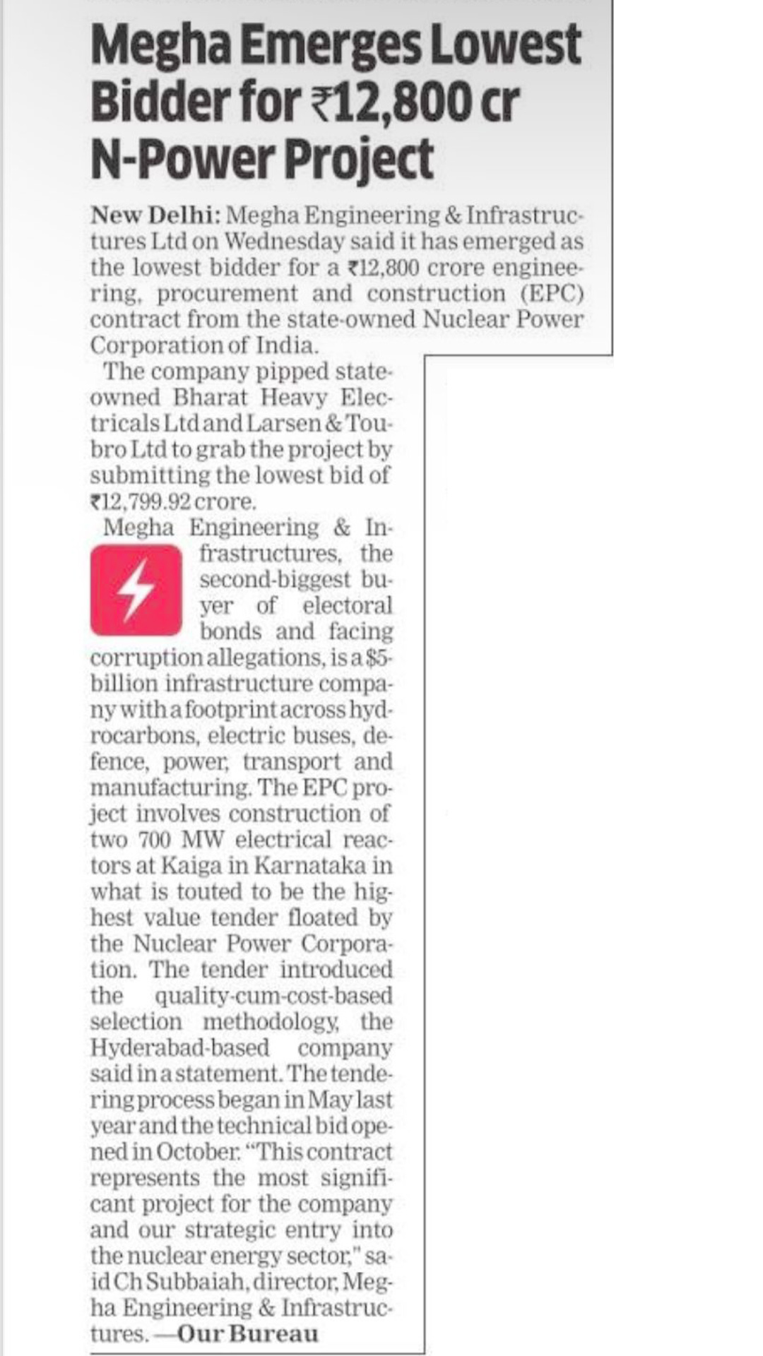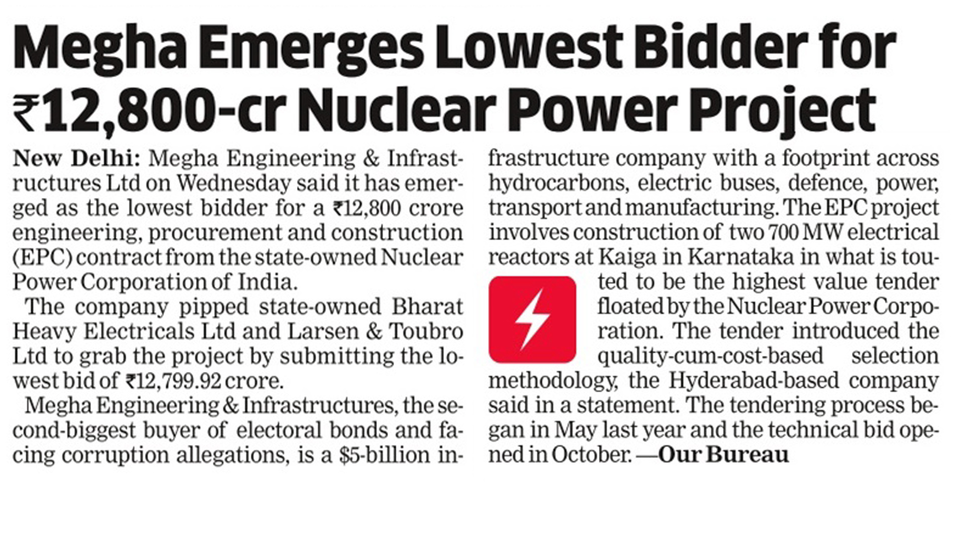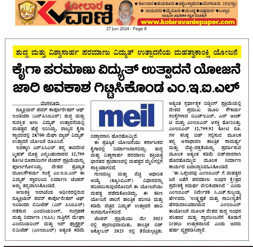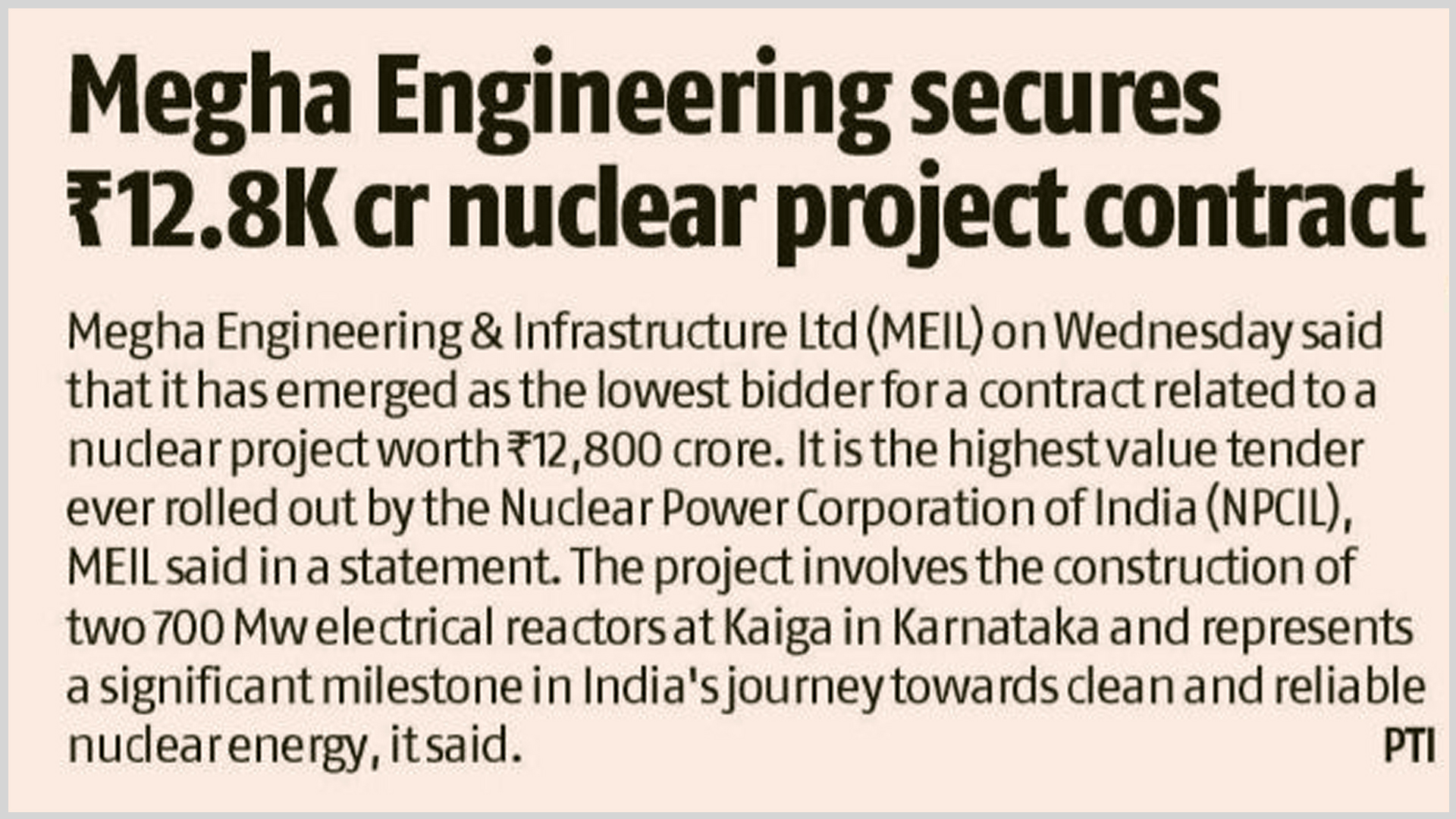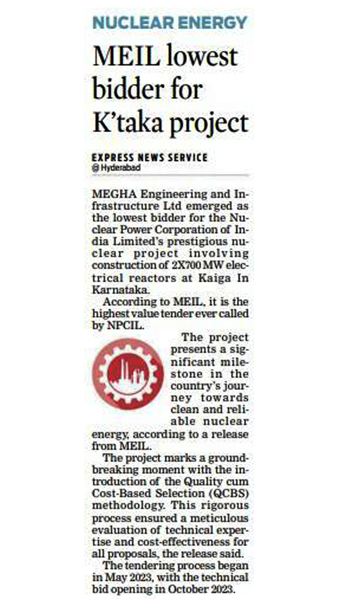 MEIL Wins Landmark EPC Contract from NPCIL MEIL is happy to announce that it has emerged as the lowest bidder for the Engineering, Procurement, and Construction (EPC) contract by the Nuclear Power Corporation of India Limited (NPCIL) under the Department of Atomic Energy.